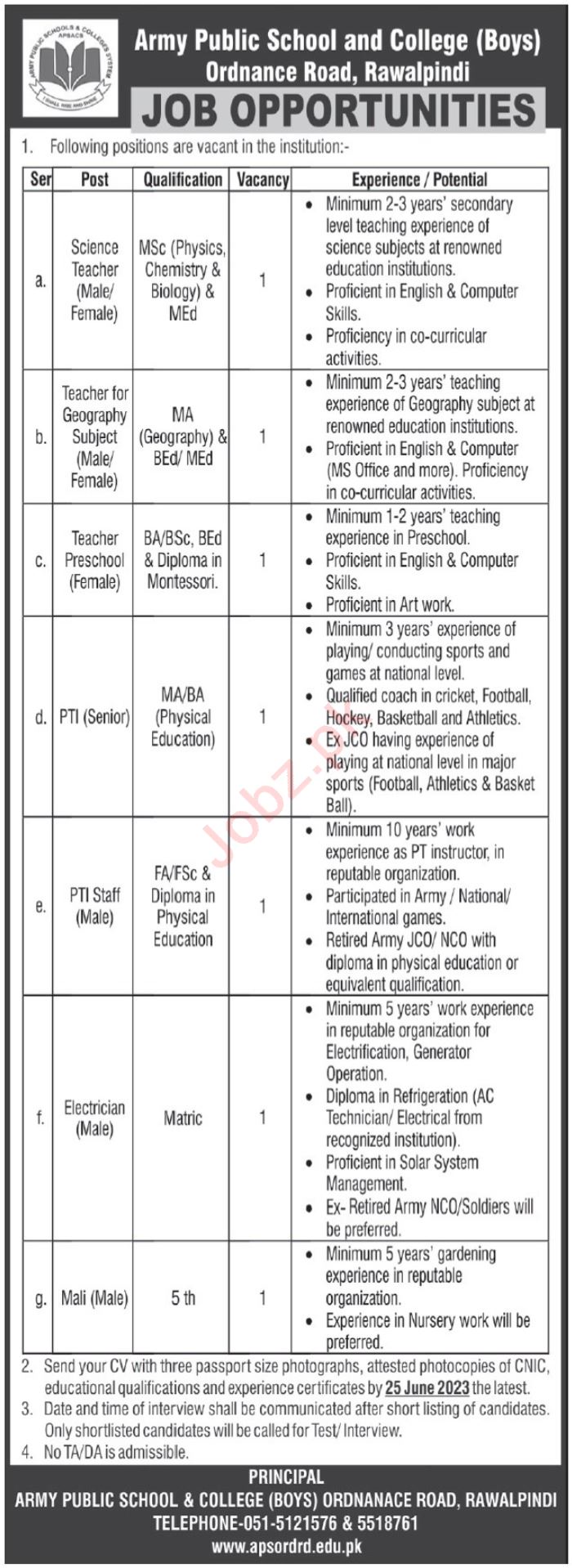 Army Public School & College APS&C is looking for candidates for following posts as per job advertisement published in daily Express Tribune Newspaper of June 11, 2023 for location Rawalpindi, rawalpindi Punjab Pakistan: