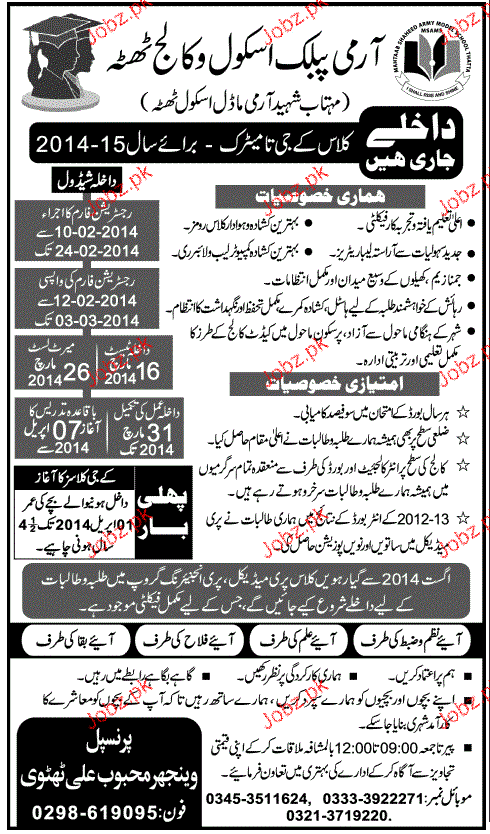 Army Public School and College Thatta Admission in Class KG to Matric in Thatta Read newspaper ad for exact details.