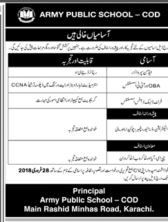 Army Public School APS COD Rashid Minhad Road Karachi Jobs
