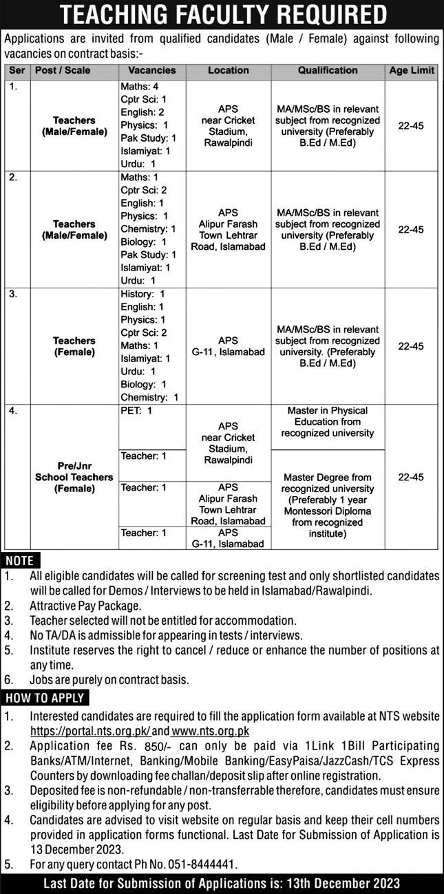 Army Public School APS latest Classifieds Teaching jobs and others can be applied till December 13, 2023 or as per closing date in newspaper ad. Read complete ad online via NTS to know how to apply on latest Army Public School APS job opportunities.