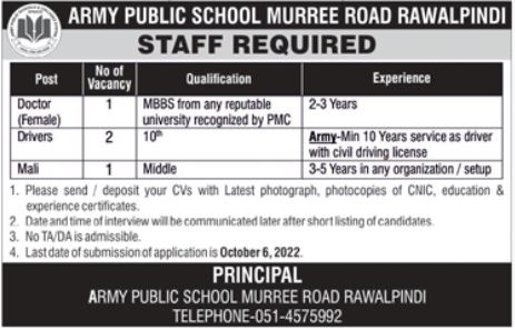 Vacant posts including driver, mali and female doctor are announced in Army Public School APS Rawalpindi, rawalpindi Punjab Pakistan as per 27 September 2022 advertisement in daily Jang Newspaper. Persons with Intermediate, MBBS, Middle and Matric etc. education can apply.
