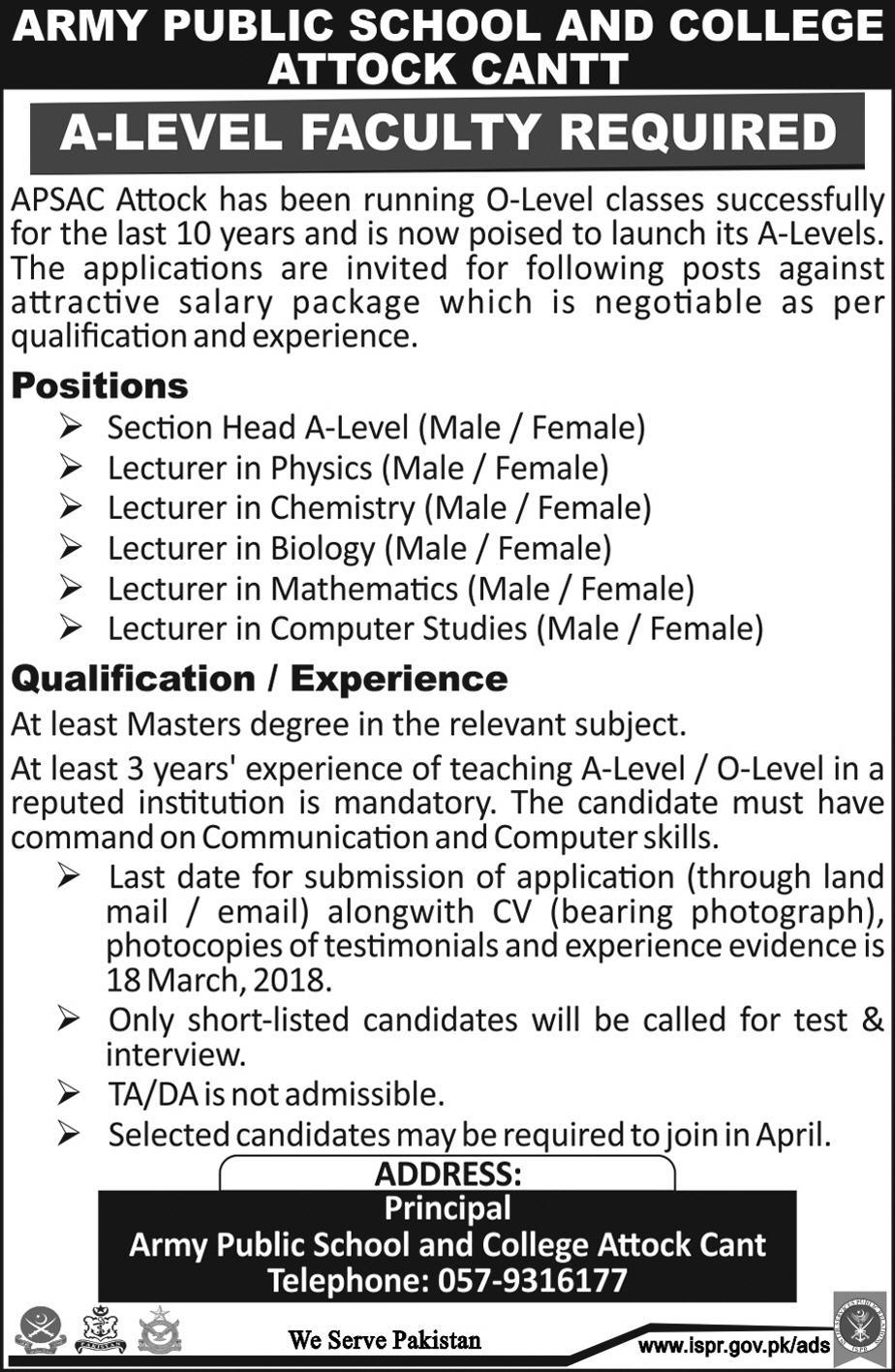 Male / Female Section Head A-Level, Male / Female Lecturers For A Level Faculty for For the Subject of Physics, Chemistry, Biology, Maths and Computer Studies having Master Degree MA / MSc in Relevant Subject with 3 year teaching Experience are required in Army Public School & College APS in Attock Cant.