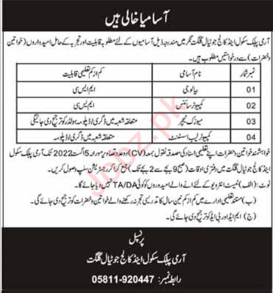 Army Public School & College APSACS Jutial Gilgit, Pakistan Army is looking for candidates for following posts as per job advertisement published in daily Mahasib Newspaper of July 30, 2022 for location Gilgit, gilgit Gilgit Baltistan Pakistan: