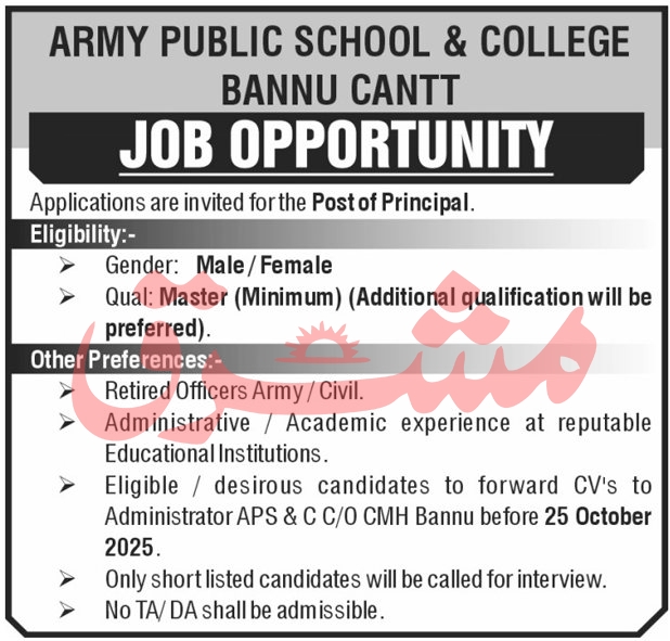 Army Public School & College APS&C Cantt Bannu, bannu Khyber Pakhtunkhwa KPK Pakistan invites applications from eligible candidates for the post of principal, female staff and male staff as per advertisement of October 16, 2025 published in daily Mashriq Newspaper. Educational qualifications required MS, Master and Bachelor etc.