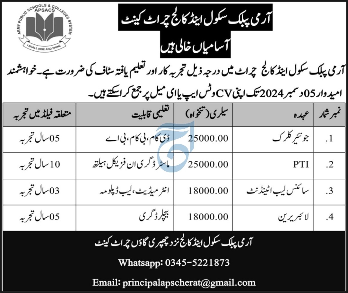 Pakistan Army, Army Public School & College APS&C Cherat invites applications for job positions advertised in daily Aaj dated 13 November 2024 for following vacancies in Nowshera, nowshera Khyber Pakhtunkhwa KPK Pakistan.