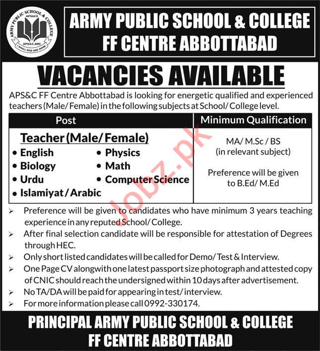 Army Public School & College APS&C FF Center Abbottabad, Pakistan Army, Government of Pakistan is seeking candidates for the posts of Teacher, Female Teacher, English Teacher, Biology Teacher, Urdu Teacher, Islamiyat Teacher, Arabic Teacher, Physics Teacher, Computer Science Teacher.