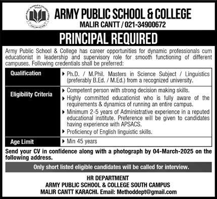 Army Public School & College APS&C jobs advertisement dated about 26 February 2025 in daily Express Newspaper invites application for the vacant post of principal in Malir Cantonment Karachi, karachi Sindh Pakistan. Educational qualifications required Master, B.ed, Phd, M.ed and Mphil etc.