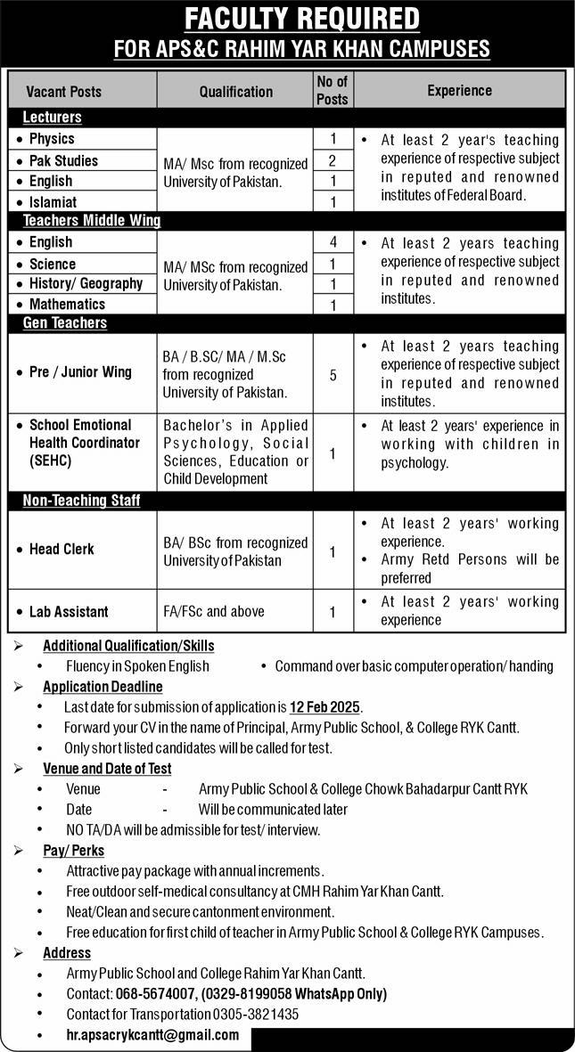 Army Public School & College APS&C jobs advertisement dated about 3 February 2025 in daily Express Newspaper invites application for the vacant post of science teacher, head clerk, history teacher, maths teacher, lab assistant, lecturer, english teacher, school emotional health coordinator, geography teacher, lecturer physics, lecturer pak studies, lecturer english, teachers middle wing and lecturer islamiat in Rahim Yar Khan, rahim yar khan Punjab Pakistan. Preferred Education is Mphil, Master, Bachelor and MS etc.
