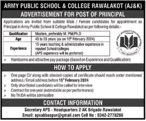 Pakistan Army, Army Public School & College APS&C invites applications for job positions advertised in daily Ausaf dated 8 February 2024 for following vacancies in Rawalakot, rawalakot AJK Pakistan.
