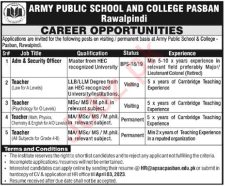 Army Public School & College APS&C is looking for candidates for following posts as per job advertisement published in daily Jang Newspaper of March 26, 2023 for location Rawalpindi, rawalpindi Punjab Pakistan: