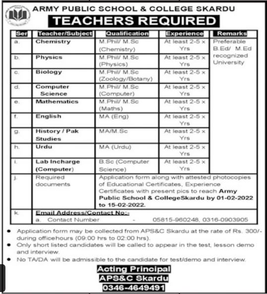 Vacant posts including physics teacher, urdu teacher, chemistry teacher, pak study teacher, biology teacher, computer science teacher, teacher, english teacher, mathematics teacher, history teacher and lab incharge are announced in Army Public School & College Skardu Gilgit Baltistan Pakistan as per 25 January 2022 advertisement in daily K2 Newspaper. Candidates with M.ed, MA, Mphil, M.sc, BCS, B.ed, Bachelor and Others etc. educational background will be preferred.