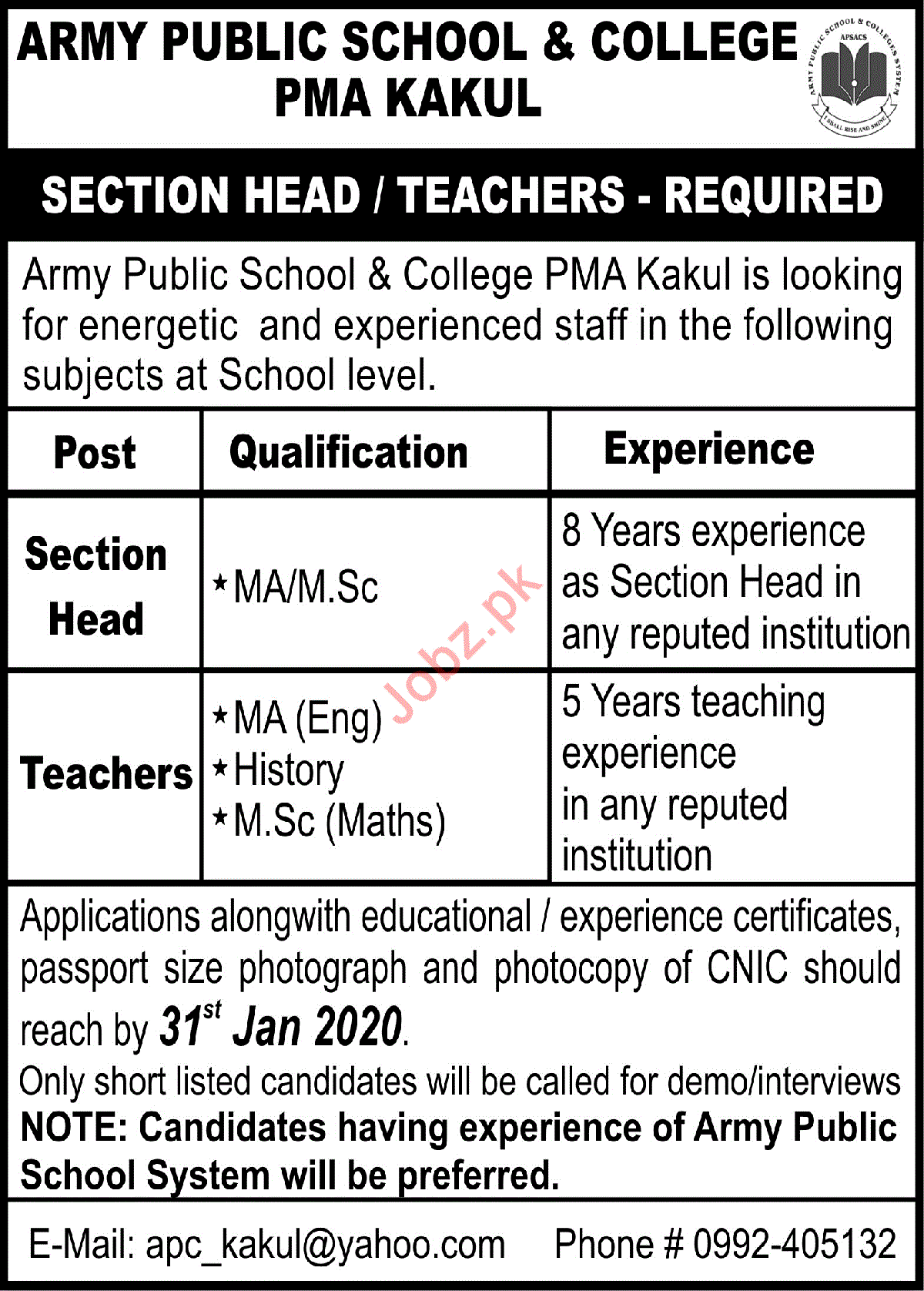 Vacancies in Army Public School & College APS&C Advertisement January 2020