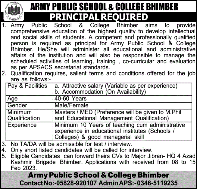 Army Public School & College APS&C jobs advertisement dated about 9 February 2023 in daily Ausaf Newspaper invites application for the vacant post of principal in Bhimber, bhimber AJK Pakistan. Persons with Master, Mphil and M.ed etc. education can apply.