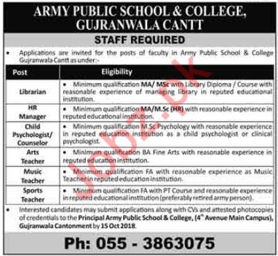 Army Public School & College Gujranwala Cantt Jobs 2018