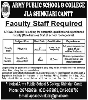 Army Public School & College invites applications for job positions advertised in daily Aaj dated 2 September 2022 for following vacancies in Mansehra, mansehra Khyber Pakhtunkhwa KPK Pakistan.
