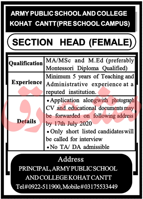 Vacancies in Army Public School & College APS&C Advertisement July 2020