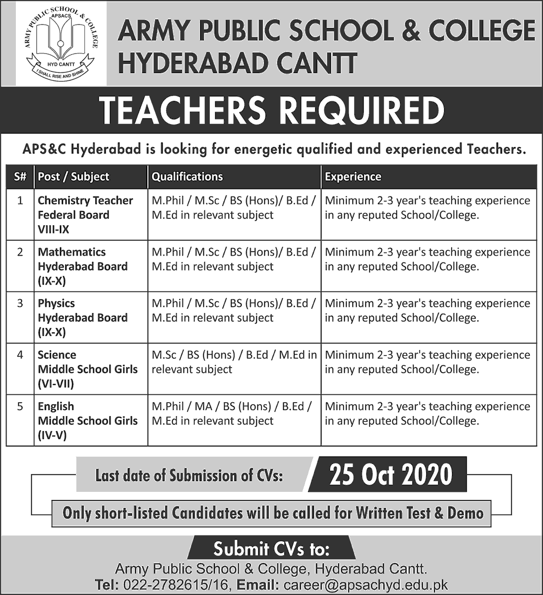 Army Public School & College Jobs 2020 In Hyderabad Cantt