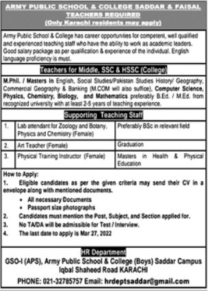 Vacancies in Army Public School & College APS&C Advertisement March 2022
