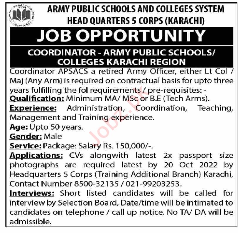 Army Public School & College is looking for candidates for following posts as per job advertisement published in daily Dawn Newspaper of October 17, 2022 for location Karachi, karachi Sindh Pakistan: