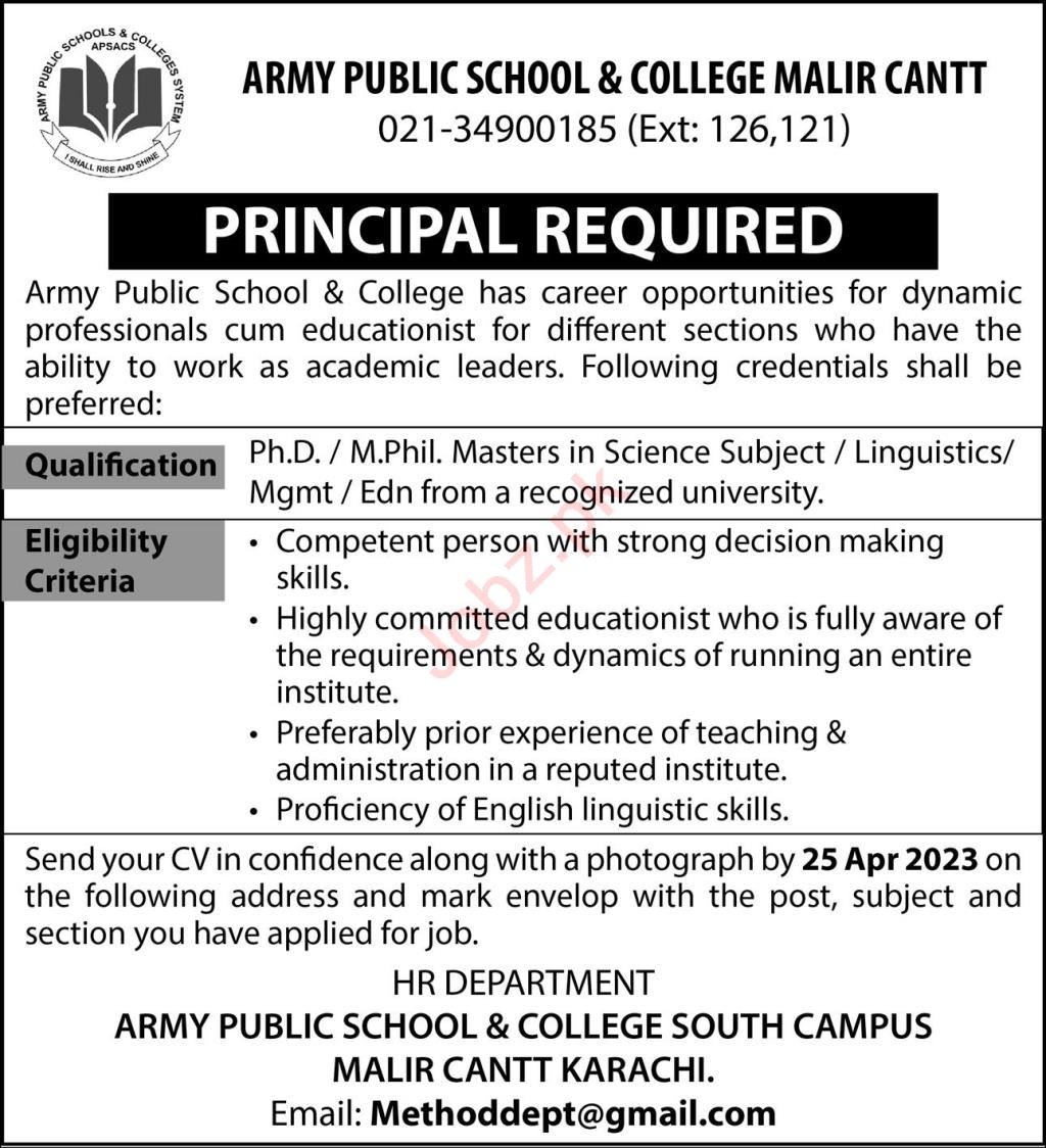 Army Public School & College APS&C jobs advertisement dated about 16 April 2023 in daily Jang Newspaper invites application for the vacant post of principal in Karachi, karachi Sindh Pakistan. Educational qualifications required Phd and Mphil etc.