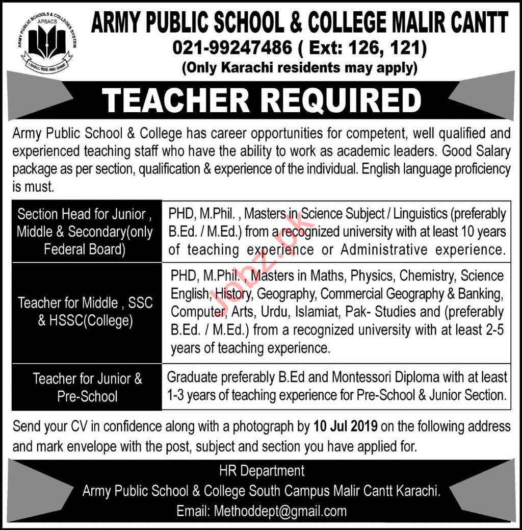 Vacancies in Army Public School & College APS&C Advertisement June 2019