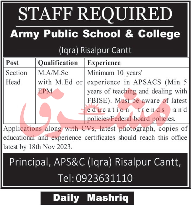 Army Public School & College APS&C invites applications for job positions advertised in daily Mashriq dated 9 November 2023 for following vacancies in Risalpur, risalpur Khyber Pakhtunkhwa KPK Pakistan.