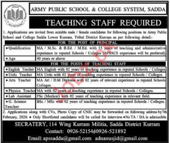 Army Public School & College APS&C Sadda Invites applications from highly educated expert adn experienced professionals for the post of Teacher, English Teacher, Urdu Teacher, Art Teacher, Physics Teacher, Lab Assistant, General Science Teacher in District Kurram.