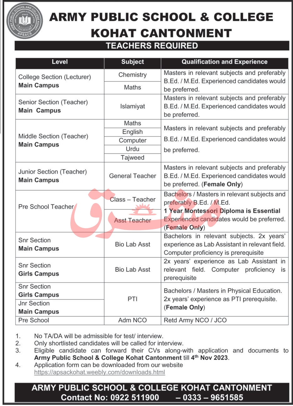 Army Public School & College APS&C is looking for candidates for following posts as per job advertisement published in daily Mashriq Newspaper of October 28, 2023 for location Kohat, kohat Khyber Pakhtunkhwa KPK Pakistan: