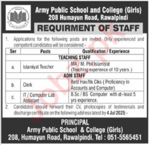 Army Public School & College APS&C jobs advertisement dated about 22 June 2025 in daily Jang Newspaper invites application for the vacant post of islamiyat teacher, teacher, clerk, it assistant and computer lab assistant in Lalazar Rawalpindi, rawalpindi Punjab Pakistan. Bachelor, Master and Intermediate etc. educational qualification will be preferred.