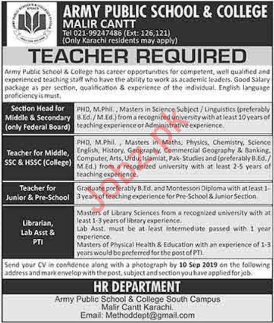 Army Public School & College is looking for qualified and educated individuals for the posts of Subject Teacher, Math Teacher, Physics Teacher, Chemistry Teacher, Science Teacher, English Teacher, History Teacher, Geography Teacher, Commercial Geography Teacher, Banking Teacher, Computer Teacher, Arts Teacher, Urdu Teacher, Islamiat Teacher, Pak Studies Teacher, Montessori Teacher, Librarian, Lab Assistant, Physical Training Instructor PTI in Malir Cantt Karachi.