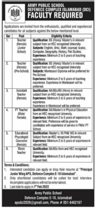 Army Public School APS Islamabad Pakistan invites applications from eligible candidates for the post of assistant teacher, educational psychologist counselor, teacher, female teacher, music teacher, pt teacher and preschool teacher as per advertisement of January 29, 2022 published in daily Nawaiwaqt Newspaper. Preferred Education is B.E, Master, Mphil, BA, MS and Others etc.