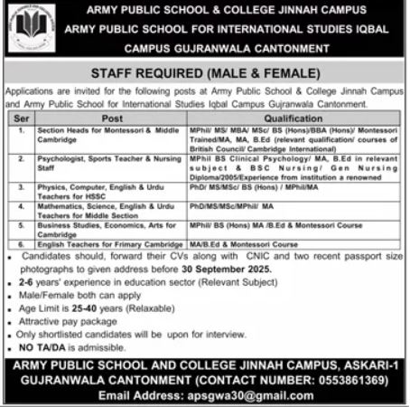 Vacancies in Army Public School for International Studies Advertisement September 2025