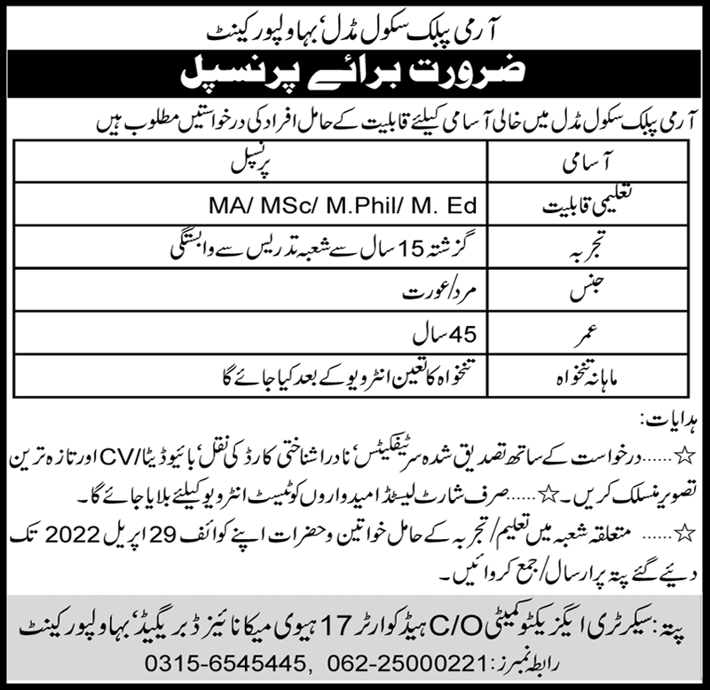 Army Public School invites applications for job positions advertised in daily Nawaiwaqt dated 24 April 2022 for following vacancies in Bahawalpur, bahawalpur Punjab Pakistan.