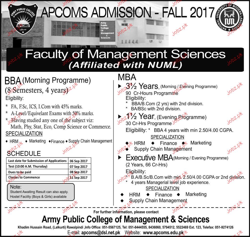Army Public School of Management and Sciences Admission in MBA and BBA in Rawalpindi. Read newspaper ad for exact details.