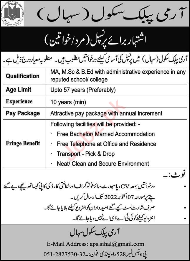 Vacant posts including principal are announced in Army Public School Rawalpindi, rawalpindi Punjab Pakistan as per 18 September 2022 advertisement in daily Express Newspaper. Persons with B.ed, Bachelor, M.sc, MA and Master etc. education can apply.