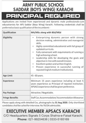 Army Public School Saddar Boys Wing Karachi Job 2020