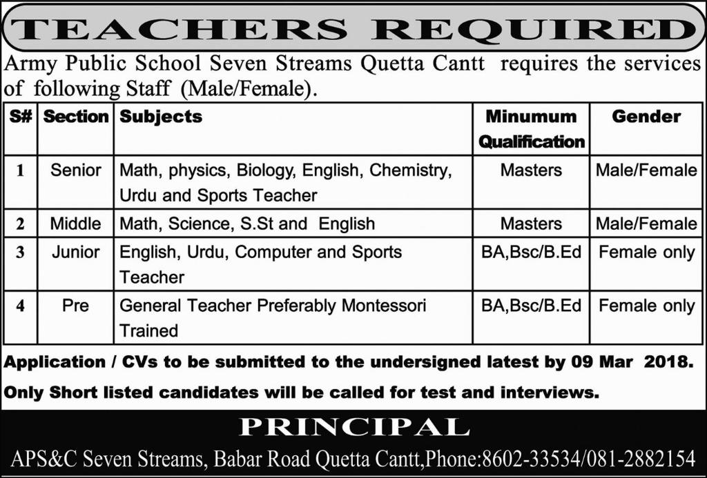 Male / Female Teachers For the Subject of Maths, Physics, Biology, English, Chemistry, Junior Section Teachers, Middle Section Teachers and Pre School Teachers are required in Army Public School Seven Stream Quetta Cant. Canddidate Must have BA, BSc, MA, MSc. B.Ed with Teaching Experience.