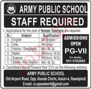 Vacant posts including teacher, science teacher, math teacher, sports teacher, english teacher, geography teacher, urdu teacher, history teacher and arts teacher are announced in Army Public School Rawalpindi, rawalakot Punjab Pakistan as per 31 July 2022 advertisement in daily Jang Newspaper. Preferred Education is Bachelor, MA, Master and M.sc etc.
