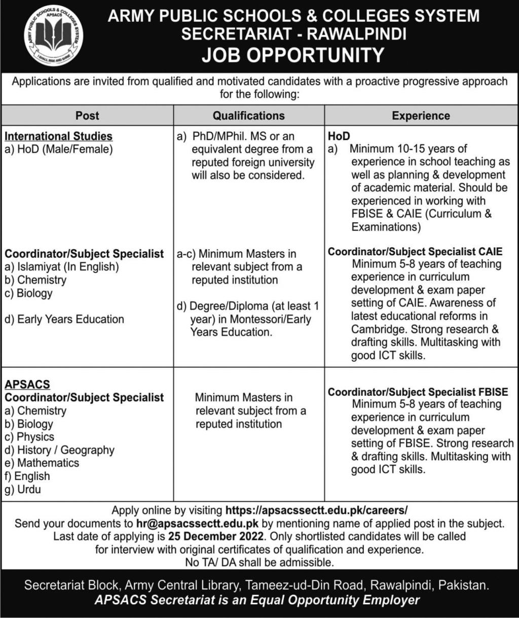 Vacancies in Army Public School & College APS&C Advertisement December 2022