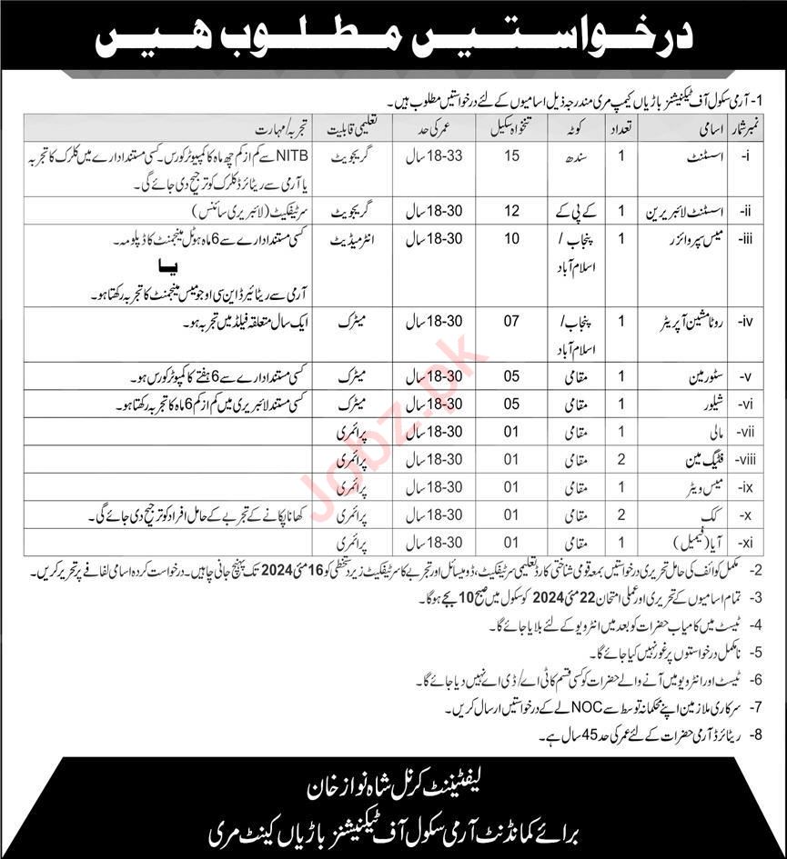 Vacant posts including cook, aya, shailwar, fitting man, rota machine operatory, mess waiter, store man, mali, mess supervisor, assistant and assistant librarian are announced in Army School of Technicians Barian Murree, murree Punjab Pakistan as per 28 April 2024 advertisement in daily Express Newspaper. Educational qualifications required Middle, Matric, Intermediate and Primary etc.