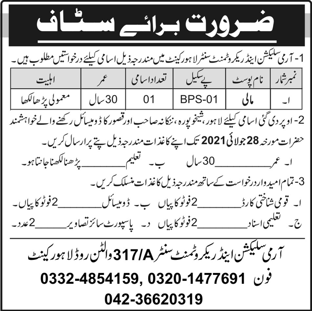 Army Selection and Recruitment Center Lahore Jobs 2021