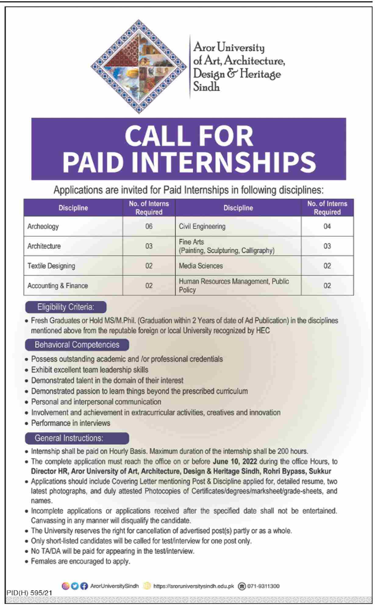 Aror University of Art Architecture Design & Heritage is looking for candidates for following posts as per job advertisement published in daily Dawn Newspaper of June 4, 2022 for location Sukkur, sukkur Sindh Pakistan: