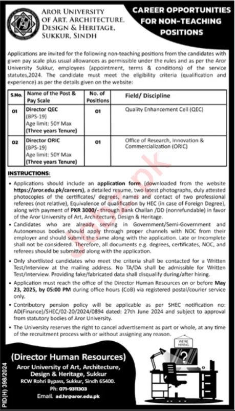 Aror University of Art Architecture Design & Heritage invites applications for job positions advertised in daily Jang dated 4 May 2025 for following vacancies in Sukkur, sukkur Sindh Pakistan.