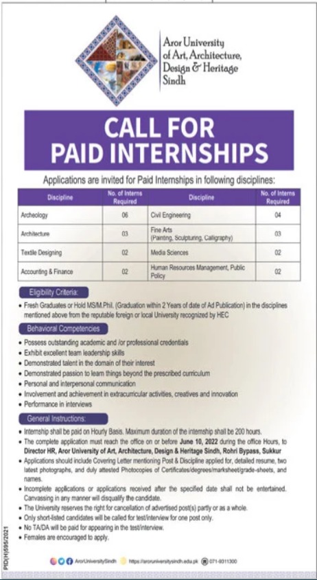 Aror University of Art Architecture Design & Heritage invites applications for job positions advertised in daily Jang dated 4 June 2022 for following vacancies in Sukkur, sukkur Sindh Pakistan.