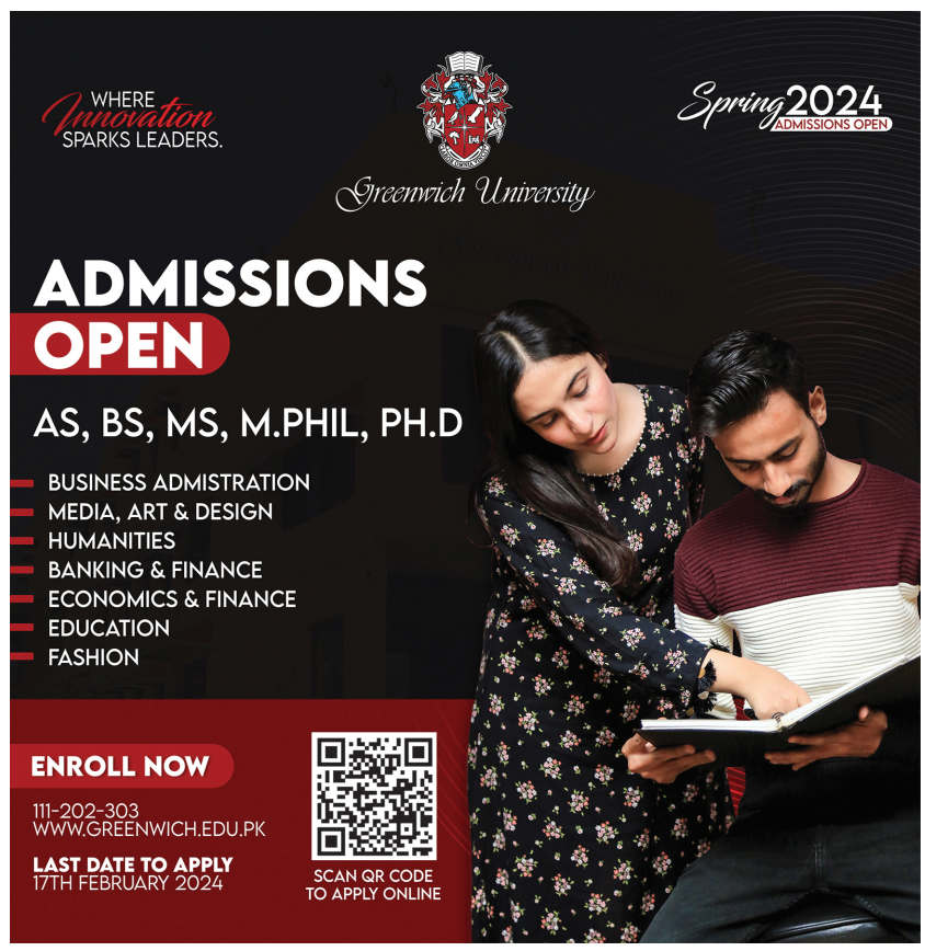 Admissions in Greenwich University 2024 for AS, BS, MS, MPhil, PhD has been announced. Eligible students can apply for academic admissions 2024 in Greenwich University Karachi Sindh Pakistan for Science University. Students for admissions in ADP, Mphil, BS, Phd and MS & criteria can apply as per Private institute admission policy 2024 before closing date February 28, 2024 as per advertisement. Read newspaper ad for exact details.