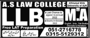 AS Law College admissions 2022 for LLB Master of Arts MA. has been announced. Students can enroll for admissions in AS Law College Rawalpindi Punjab Pakistan for academic year 2022 to continue campus based or online education in Teaching College. Eligible candidates for admissions in MA, LLb and Master can apply as per Private institute criteria and before closing date 8 October 2022 after reading advertisement online. Read newspaper ad for exact details.