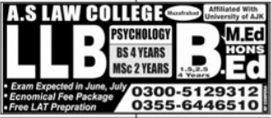 AS Law College affiliated with University of Azad Jammu & Kashmir invites applications for admissions in LLB, BS Psychology, MSc Psychology, B.Ed Hons & M.Ed in Muzaffarabad AJK 2021. Read newspaper ad for exact details.