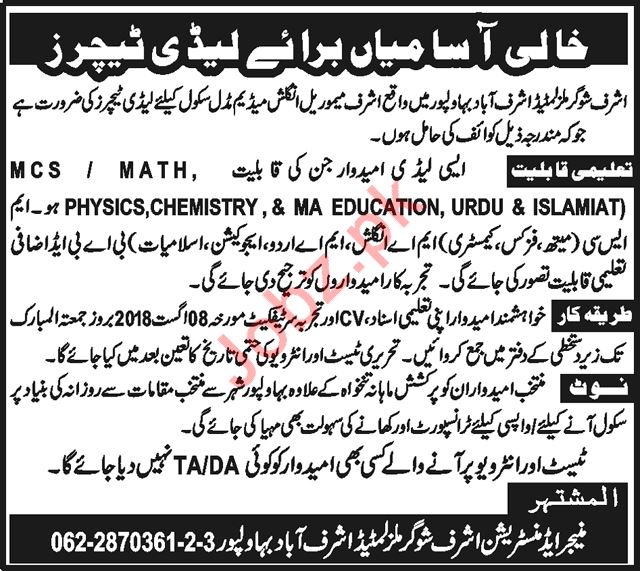 Ashraf Memorial English Medium School Lady Teachers Jobs