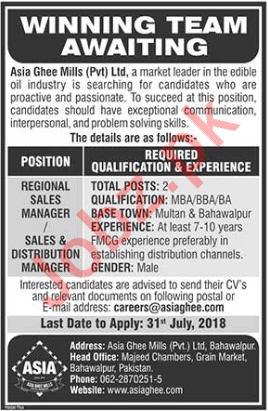 Asia Ghee Mills Bahawalpur Jobs 2018 For Sales Manager