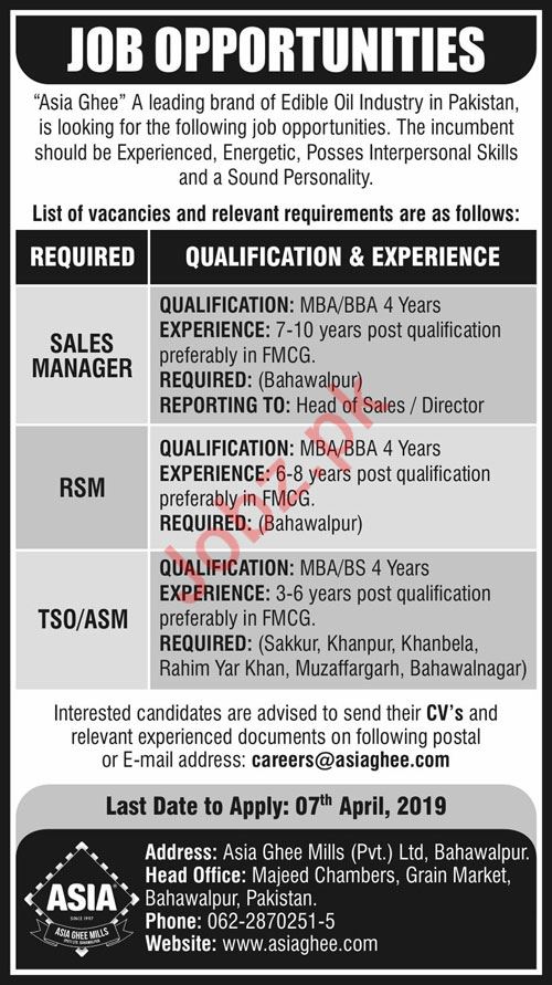 Vacancies in Asia Ghee Mills Pvt Limited Advertisement March 2019